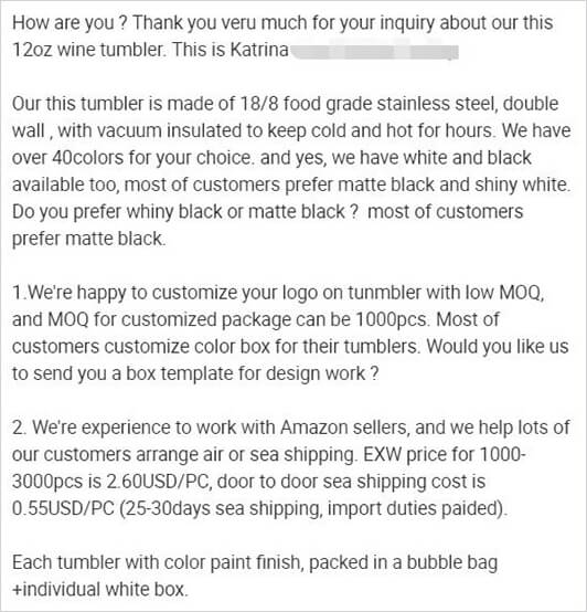 Parlez de votre produit, frais d'expéditionL'emballage et tous les autres éléments auxquels vous pouvez penser. Ne craignez pas de demander trop et que le fournisseur vous ignore. S'il n'est pas réceptif, passez simplement à un autre. Si un fournisseur n'est pas disposé à vous parler dès le départ, cela signifie qu'il ne se soucie pas de vous. Ne comptez pas sur lui pour s'améliorer par la suite.