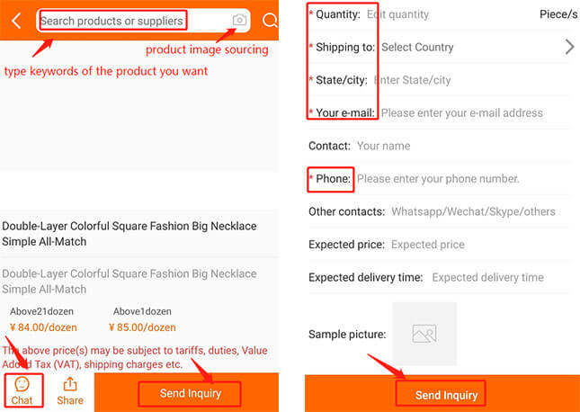 The most straightforward method is to type the keywords of what you want, and find the exact products or suppliers offering similar items. You can also search for products via images. For those suppliers looking good, you can engage in online chat with them for quotes or send inquiries as shown below.