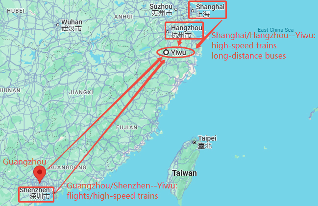 بالإضافة إلى ذلك، يختار العديد من الأشخاص القيام برحلات دولية مباشرة إلى قوانغتشو, شنتشن, شنغهاي، و هانغتشو. بعد ذلك، من السهل الوصول إلى ييوو عبر الرحلات الجوية اليومية المباشرة أو القطارات عالية السرعة أو الحافلات (حافلات المسافات الطويلة). سأستخدم "الحافلة" من الآن فصاعداً.