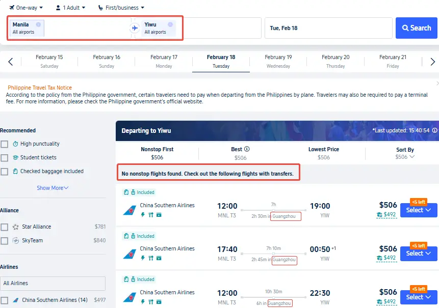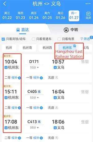 في الوقت الحالي، لا توجد قطارات عالية السرعة مباشرة من قوانغتشو إلى ييوو، لذا يلزم إجراء انتقالات.