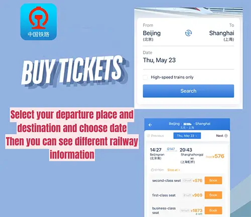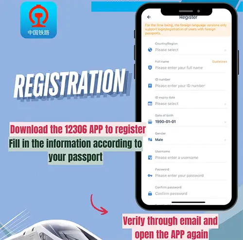 بالنسبة للأجانب المقيمين في الصين أو الزائرين المتكررين لها، يمكنك تنزيل تطبيق السكك الحديدية 12306 (中国铁路 12306) هو خيار مناسب للحجز عبر الإنترنت. سجّل بجواز سفرك وتحقّق من خلال البريد الإلكتروني، ويستغرق ذلك من 3 إلى 5 أيام. لاحظ أنه يلزم وجود رقم هاتف صيني لشراء التذاكر، ولا يمكن شراء التذاكر إلا في غضون 15 يوماً من السفر - فالتذاكر التي يتم إصدارها قبل الموعد المحدد لن تكون متاحة. انقر على الصور أدناه لعرض المعلومات التفصيلية.