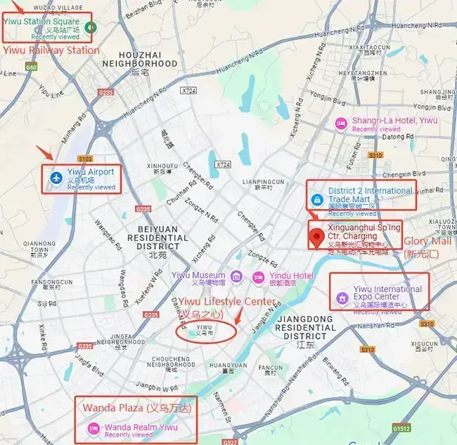 لقد حددت سوق ييوو، ومحطة السكك الحديدية، والمطار، ومركز ييوو الدولي للمعارض، ومراكز التسوق الرئيسية باللون الأحمر. سيساعدك هذا على اختيار أفضل موقع فندق في ييوو بسهولة أكبر. دعنا نلقي نظرة!
