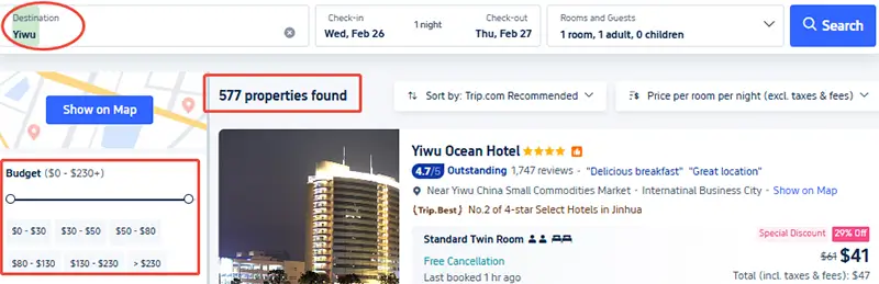 يُعدّ موقعا Trip.com وTrip.com الأكثر شهرة وملاءمة، حيث يوفران مئات الفنادق من الفنادق الاقتصادية إلى الفاخرة في ييوو. ومع ذلك، يتوفر لدى Trip.com المزيد من الخيارات.