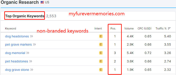 For example, MyFureverMemories, established in 2020, taps into the deep bond between pet owners and their pets and specializes in selling customized pet tombstones and memorial items. The pet funeral industry is relatively niche, so non-branded keywords are easier to rank highly. MyFureverMemories seized this opportunity to optimize SEO keywords and rank on the top page of Google, with around 11k organic traffic in the US.